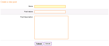 If there is no post matching the position you want to add to the organization, you have to create it. Go back on the Organization's post tab. Click on the Create Post button : you are now on a form to create a post. This post will be automatically added to the current organization and will be also available into the list of available posts to add of the other organizations.