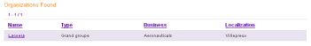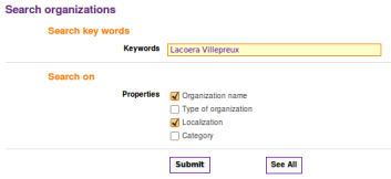 E.g., if you tick "Organization name" and "Type of organization", with the context of the "Lacoera Villepreux" search seen previously, there will be no search results, because there is no organization which name equals "Lacoera" or "Villepreux" and type of organization equals "Lacoera" or "Villepreux" ("Villepreux" is only present in a city name !). To find Lacoera organization with these key words you have to tick "Organization name" and "Localization".