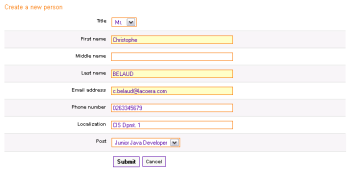 You cannot create a person if there is no post linked (via "create" or "add" actions seen below) to the organization. You need to create a person, who will automatically appear into the list. A person has a firstname, a middlename, a lastname, a post, an e-mail address, a phone number and a localization (where does he/she work ?).