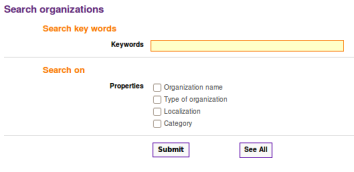 You can restrict search results by ticking search criteria (restrict the number of fields where the key words will be searched). To display the list of all Organizations in Petals Master database push the "See All" button.